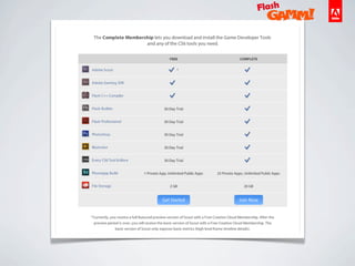 This document discusses Adobe's focus on gaming and provides an overview of their gaming tools and initiatives. It highlights that gaming is a huge industry, with the biggest platforms being browser and mobile. It promotes Adobe's gaming SDK, frameworks like Starling and Away3D, and tools like Adobe Scout and FlasCC for bringing C/C++ games to the browser. It also mentions standards-based tools like CreateJS. The document encourages developers to use Adobe's free and open-source tools to build high-performance games across platforms.