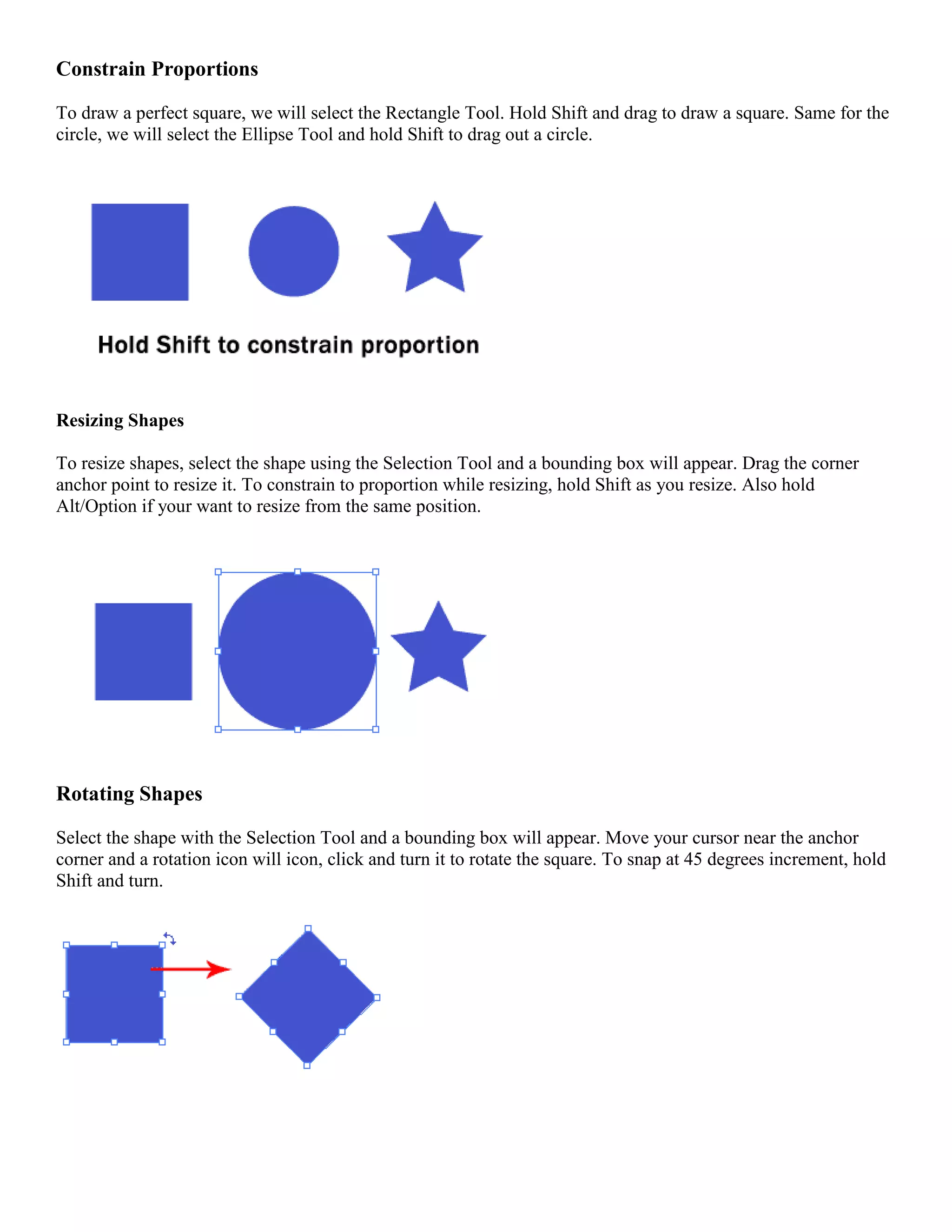The document provides instructions on using various shape, path, and drawing tools in Adobe Illustrator. It explains how to draw and manipulate shapes, paths, lines, and gradients. Techniques covered include constraining proportions while resizing, rotating shapes, drawing lines and closing paths with the Pencil tool, using the Pen tool to draw straight and curved lines, adding and removing anchor points, applying brush strokes and patterns, using compound paths, and filling objects with colors, gradients, and patterns.