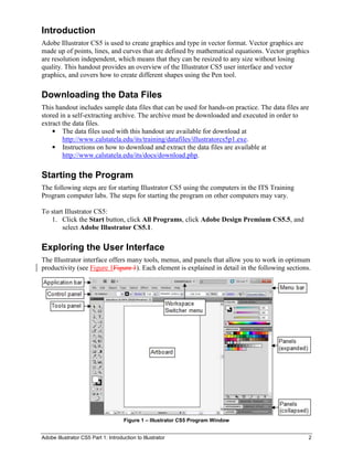 The document provides an overview of the Adobe Illustrator CS5 user interface and how to use some of its vector drawing tools. It describes starting the program, exploring the application bar, menu bar, workspace, panels like layers and tools, and how to open and work with files. Key points covered include how to create basic shapes using the rectangle and pen tools, including tracing an image to create a vector graphic of leaves and a stem. More complex techniques like creating 3D objects and adjusting paths are also demonstrated.