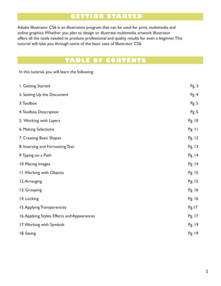 This document provides an overview of the basic functions and tools in Adobe Illustrator CS6. It begins with an introduction to getting started in Illustrator and setting up documents. It then describes each tool in the toolbox and its functions. The document also covers topics like working with layers, making selections, creating shapes, inserting and formatting text, placing images, and more basic Illustrator skills. The tutorial is intended to teach beginners the essentials of navigating the Illustrator interface and using its core tools and features.