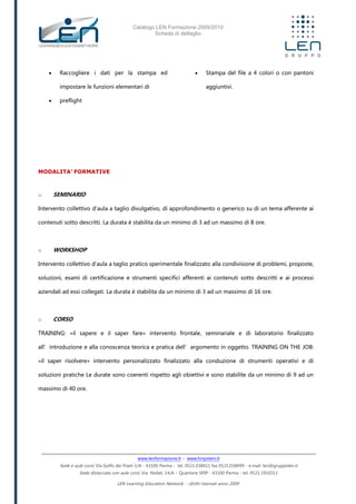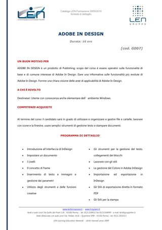 Il documento presenta il catalogo dei corsi di formazione offerti da LEN per l'anno 2009/2010, con particolare focus sul corso di Adobe InDesign, della durata di 16 ore. Il corso è rivolto a utenti con conoscenze di base di Windows e mira a fornire competenze pratiche nell'utilizzo del software per la creazione e gestione di documenti. Inoltre, vengono descritti vari formati di intervento formativo, inclusi seminari, workshop e corsi di training.