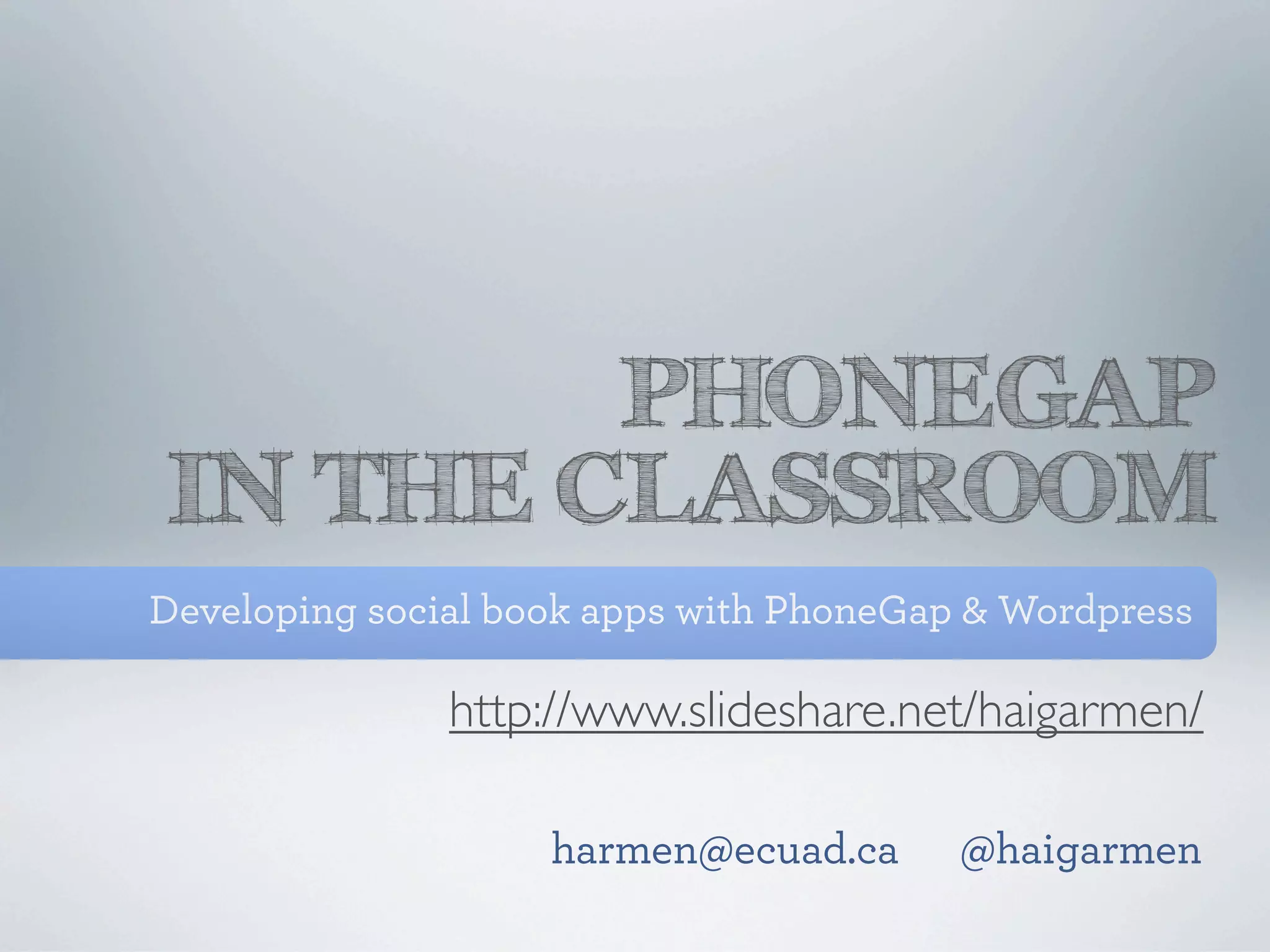 This document discusses developing social book apps using PhoneGap and WordPress. It covers concepts like using PhoneGap to create publications for mobile platforms, balancing reading with social functionality, and prototyping with jQuery Mobile. It also discusses using a JSON API with WordPress as a content management system to power a social book app built with HTML, CSS, JavaScript and compiled to a native app using PhoneGap. Workshops are proposed to introduce PhoneGap, prototype with jQuery Mobile, and implement a JSON API tunnel.