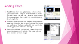 The document discusses how the author used Adobe Premier to add titles and sound to a trailer. To add titles, the author selected a default text option and inserted background images and edited text. Fonts were found using Font Space since the software fonts did not fit the genre. Images and text were added as images to the titles. Sound was added by dragging audio files into the software and trimming them for effective placement in the trailer. Adobe Premier allowed the author to easily insert titles with images and text as well as add and edit soundtracks.