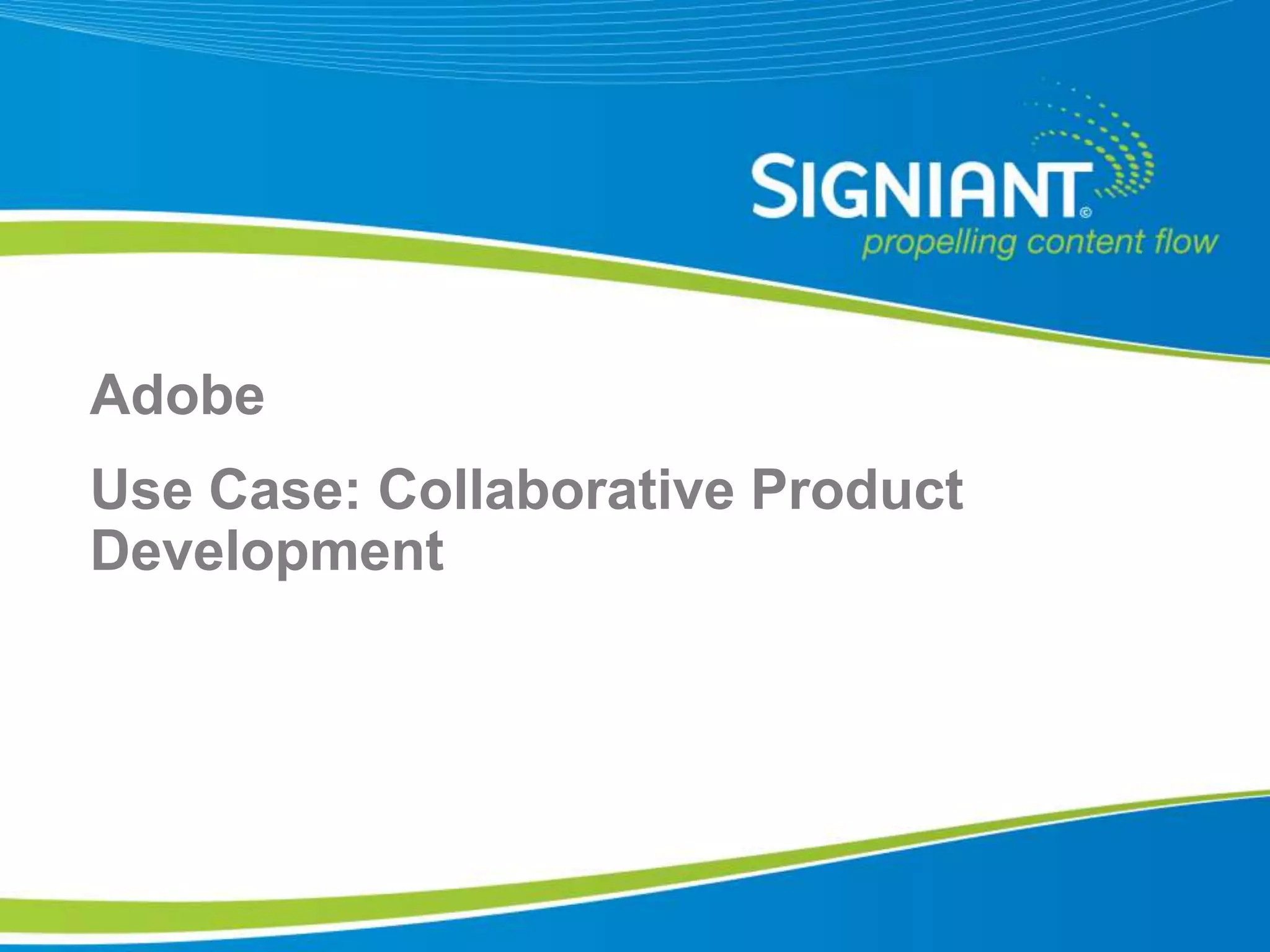 The document outlines a use case for collaborative product development at Adobe, highlighting the integration of remote sites and a central development facility in San Jose. It emphasizes the automated processes and data replication over WAN, with engineers handling 1.3-1.5TB of data each day. The goal is to improve efficiency and reduce labor through the use of Signiant's technology.