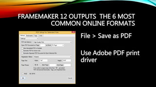 The document discusses the various electronic output options available in FrameMaker 12, including PDF and responsive HTML5 formats. It provides guidance on setting up output maps, customizing layouts, and details of related utilities and resources. Additionally, it includes links for further engagement and resources related to the author.