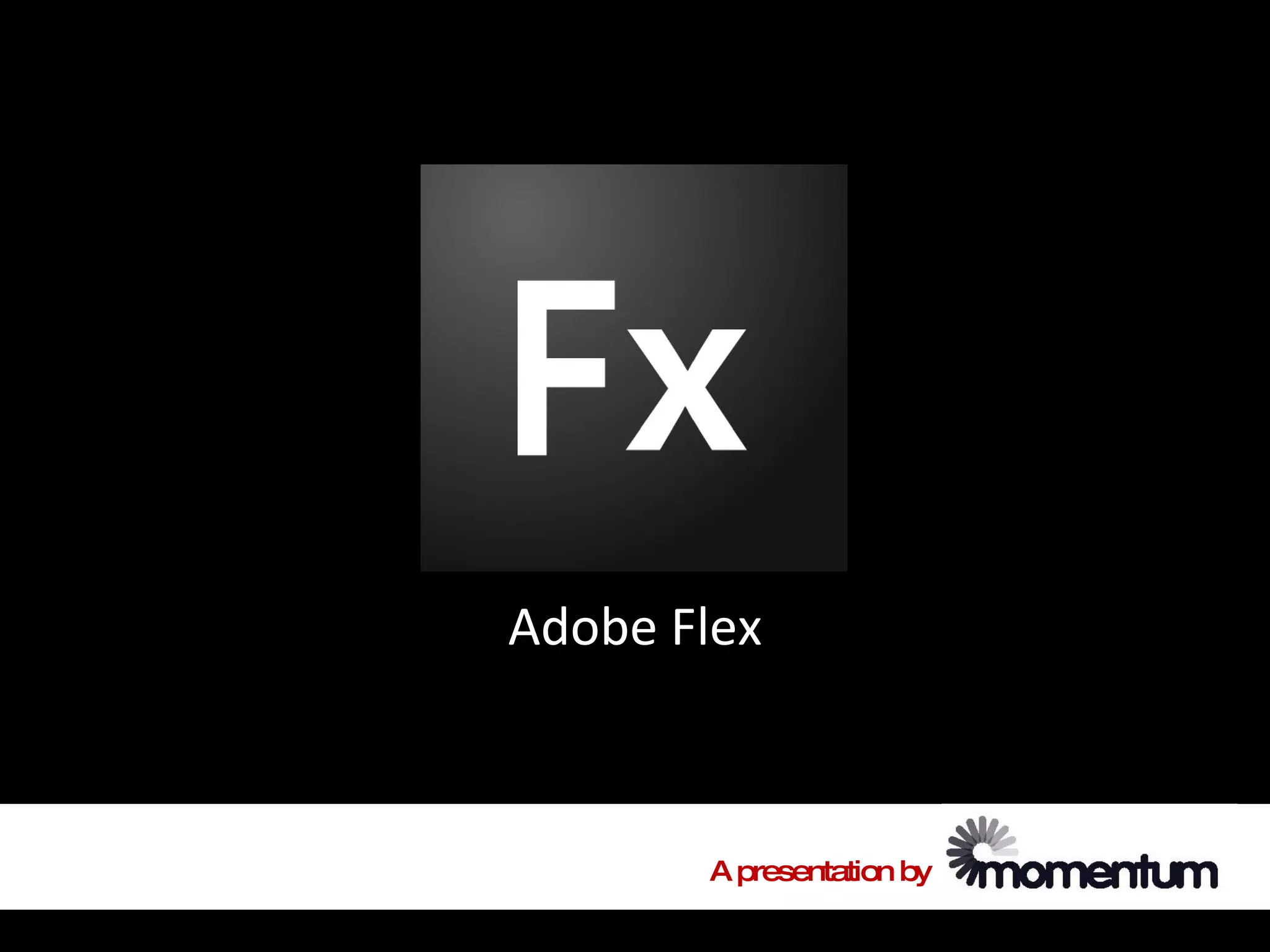 Adobe Flex is a collection of technologies for developing rich Internet applications that can be deployed to the web or desktop using Flash and AIR, and it originated from Macromedia's efforts in 2004 to create a framework for RIA development using an XML-based language; Flex allows developers to build interactive applications that take advantage of Flex's user interface components and data visualization tools for delivery across browsers and platforms.