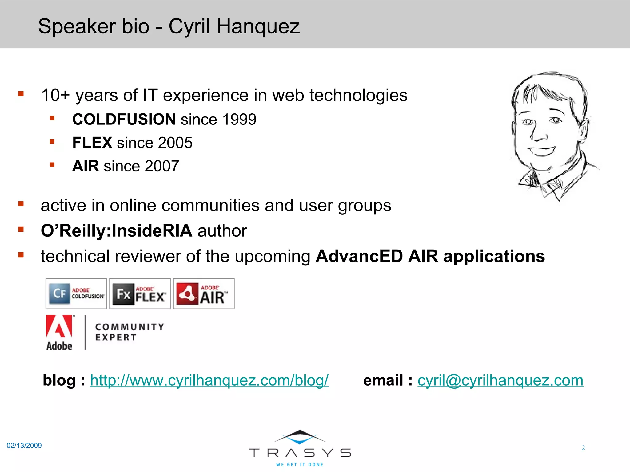 The document outlines the speaker bio and agenda for a presentation on Rich Internet Applications (RIA) and Adobe technologies, focusing on the evolution of web applications and the features of Adobe products like Flex and AIR. It discusses the characteristics of RIAs, the challenges in web development, and the integration of various Adobe technologies to enhance user experience and maintain productivity. Key tools and frameworks are highlighted, such as Adobe Flash Catalyst and ColdFusion 9, as well as advancements in text layout and collaboration services.