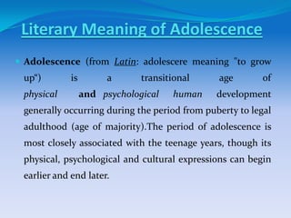 The document discusses adolescence and the role of teachers in helping adolescents through this developmental period. It covers three main stages of adolescence (early, mid, late) and characteristics of physical, cognitive, emotional, social, moral and spiritual development in young adolescents. Common problems of adolescence are also outlined such as excessive energy, misunderstandings about sex, aggressiveness/withdrawal, rebellious attitudes, physical awkwardness, and excessive daydreaming. The role of teachers is to support proper physical, mental, emotional and social development through activities, guidance, responsibility, and addressing issues like sex education and emotional challenges.