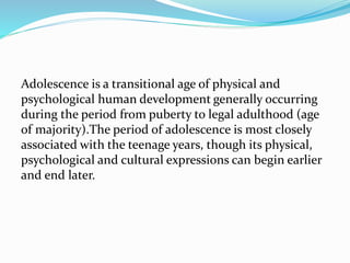 Adolescence occurs between puberty and legal adulthood, typically between ages 12-19. It involves physical, psychological, and social changes. Physically, adolescents experience puberty and rapid growth. Psychologically, they develop a separate identity from parents and form new relationships. Their cognitive abilities also advance to think more abstractly. Socially, peer relationships become important and they gain independence from family. This stage presents both opportunities and hazards as adolescents adjust to these significant developmental changes.
