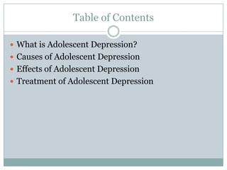 This document discusses adolescent depression. It defines adolescent depression as a mood disorder affecting around 8.3% of adolescents, characterized by persistent sadness and loss of pleasure. Causes include genetic predisposition and environmental stressors like family problems or adversity. Effects include symptoms like changes in mood, appetite, sleep, and interests. Treatments include cognitive-behavioral therapy and interpersonal therapy to help manage symptoms.