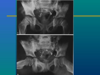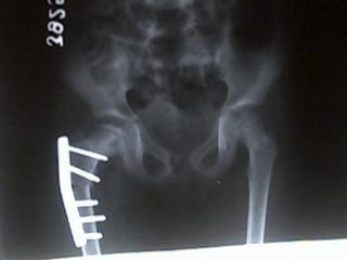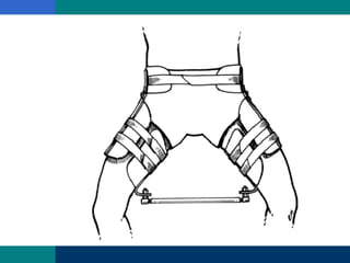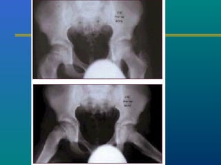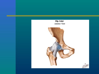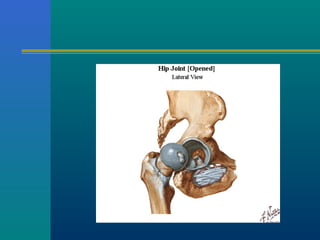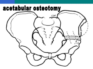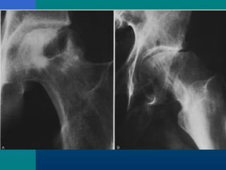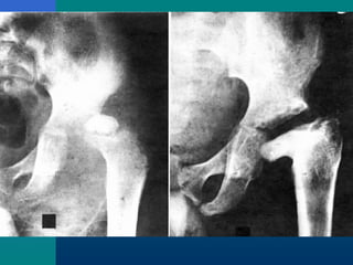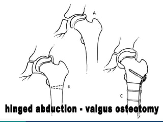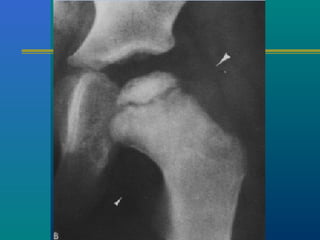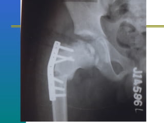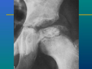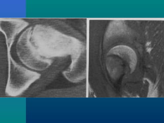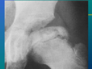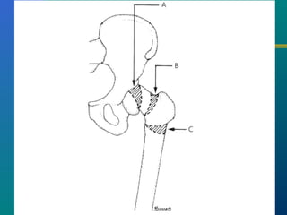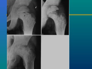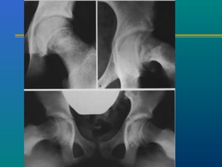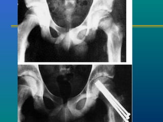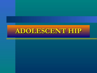 This document discusses several common causes of hip pain in adolescents, including transient synovitis, Perthes disease, slipped capital femoral epiphysis, septic arthritis, tuberculous arthritis, and idiopathic chondrolysis. For each condition, the document outlines typical presenting symptoms, potential causes, diagnostic methods like x-rays and blood tests, and treatment approaches such as rest, traction, surgery, or antibiotics. Common complications are also listed. The goal of treatment for many of these hip disorders is to relieve pain, prevent deformity, and restore hip function in adolescent patients.