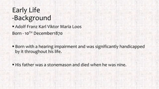 Adolf Loos was an Austrian architect born in 1870 who was influential in early modern architecture. He traveled extensively in the United States as a young man, which inspired his plain, unadorned style that rejected ornamentation. Loos believed that ornamentation was unnecessary and a waste of resources. Some of his most notable works include the Steiner House in Vienna, known for its stucco facade and tripartite design, the Rufer House which pioneered his Raumplan concept of interconnected rooms at different levels, and the Villa Mueller in Prague with its severe symmetrical design and public versus private spaces organized by floor.
