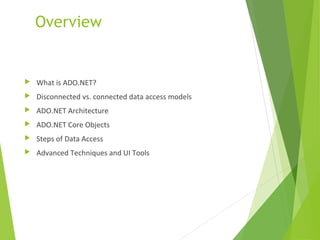 ADO.NET is a data access technology that allows applications to connect to and manipulate data from various data sources. It provides a common object model for data access that can be used across different database systems through data providers. The core objects in ADO.NET include the Connection, Command, DataReader, DataAdapter and DataSet. Data can be accessed in ADO.NET using either a connected or disconnected model. The disconnected model uses a DataSet to cache data locally, while the connected model directly executes commands against an open connection.