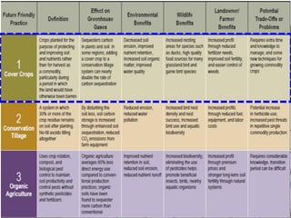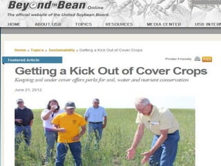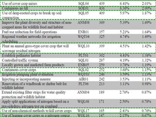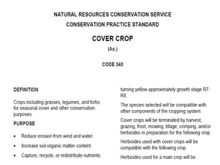 The document discusses the adoption and challenges of cover crop systems in agriculture, highlighting socio-economic factors, management skills, and the historical context of cover crop utilization. It notes that while cover crops offer environmental benefits, their adoption is hindered by issues such as increased management needs and farmers' resistance due to perceived risks. Recent surveys indicate a growing interest in cover crops, suggesting a potential shift towards more sustainable farming practices in the future.