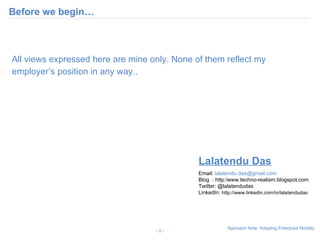 The document outlines the rapid growth of the smartphone market since 2007 and emphasizes the need for enterprises to align their mobility strategies with emerging smartphone technologies. It discusses key components of an effective mobility strategy, compares smartphone platforms, and presents a case study on implementing a CIO dashboard for improved decision-making. The presentation aims to provide a generic framework for developing enterprise mobility strategies encompassing smartphones, tablets, and netbooks.