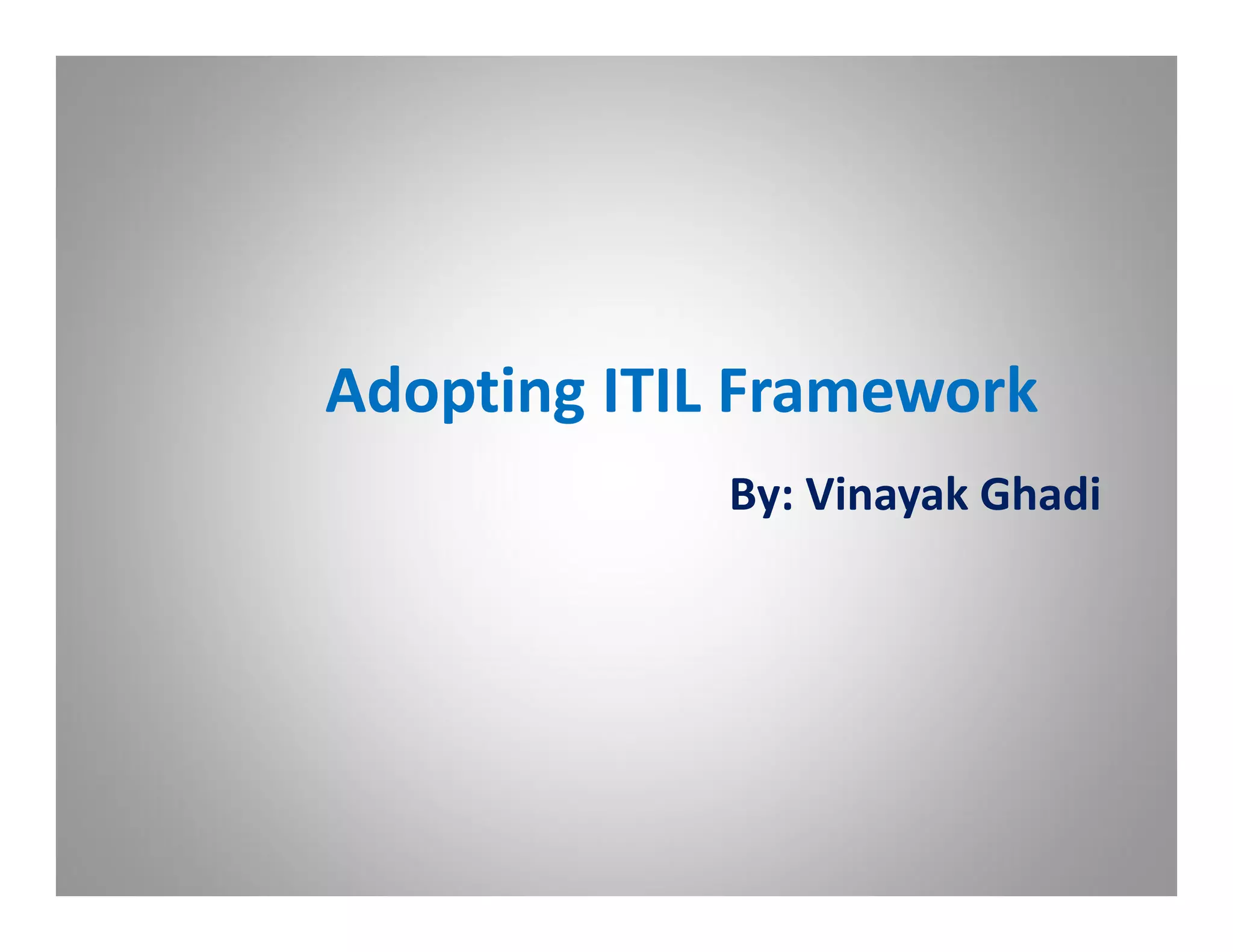 The document discusses adopting the ITIL framework to improve IT service management. ITIL is a popular framework that focuses on aligning IT services with business needs. The core of ITIL is a service lifecycle with five phases: service strategy, service design, service transition, service operation, and continual service improvement. Adopting ITIL can provide benefits like improved resource utilization and infrastructure management, but also faces challenges like assessing business impact and achieving measurable outcomes. Proper adoption requires business support, training, process implementation, and change management.