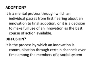 The document outlines the adoption process of innovations, detailing stages from problem observation to decision-making among different adopter categories such as innovators, early adopters, early majority, late majority, and laggards, each with distinct characteristics. It explores factors affecting adoption, including socioeconomic status, personality traits, communication behaviors, and innovation attributes like compatibility and complexity, while highlighting the social influences that drive or inhibit adoption. Additionally, it discusses the consequences of innovation adoption and the need for further research in this area.