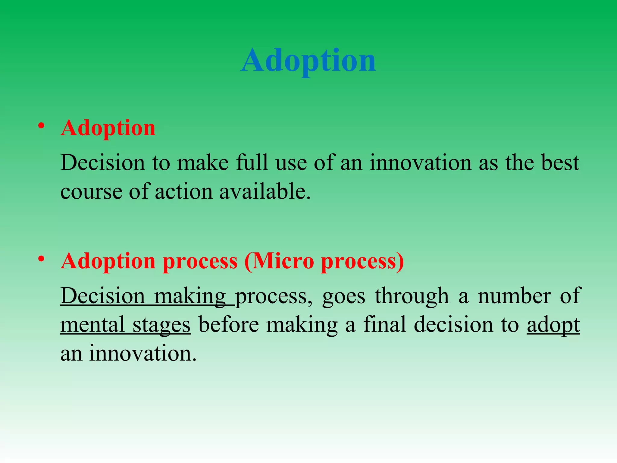 The document discusses models of the adoption of innovations by farmers. It describes several stage-based models including a 5-stage model of awareness, interest, evaluation, trial, and adoption. A 7-stage model is also presented consisting of need, awareness, interest, deliberation, trial, evaluation, and adoption. Several key points are made about the adoption process including that it is not a single decision but a process involving learning, thinking, and acting over time through different mental stages.