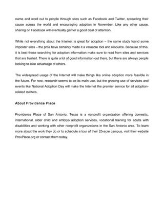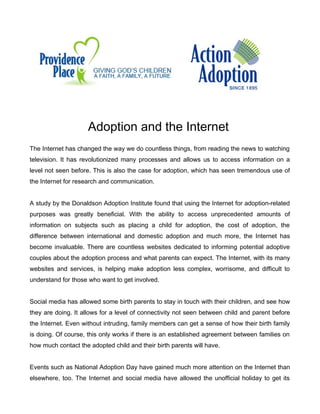 The internet has transformed the adoption process by providing vast amounts of information and aiding communication between adoptive families and birth parents. It allows easier access to adoption resources, facilitates social connections, and raises awareness for events such as National Adoption Day. While there are risks of misinformation, reputable online sources have made the internet a crucial tool in navigating adoption.