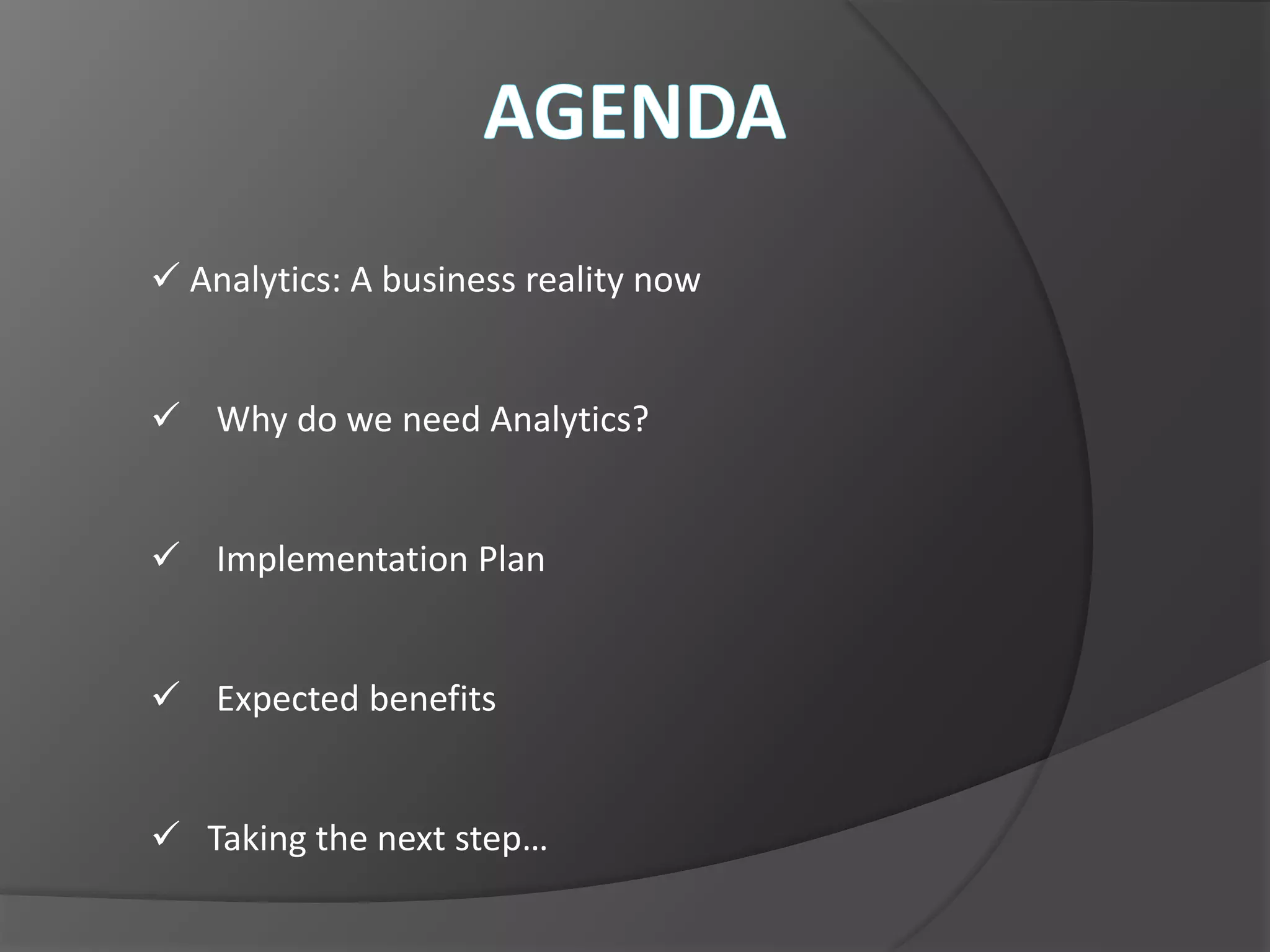 This document discusses implementing analytics for a company. It begins by stating that analytics has become a business necessity focused on fact-based decision making. The company is currently facing issues like low revenue growth and high shrinkage and attrition. The implementation plan outlines different analytics for human resources, fraud, supply chain, and marketing. Expected benefits include 15% revenue growth, 26% increase in efficiency, and reductions in shrinkage and attrition. The next steps are to gain support for implementation, build an analytics team, and spread awareness among employees.