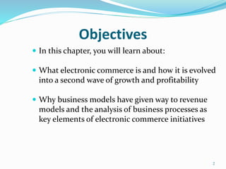 This document discusses the evolution of electronic commerce from its first wave to its current second wave. It covers key topics like business models, revenue models, analyzing business processes, using value chains and SWOT analysis to identify opportunities. While e-commerce reduces transaction costs, issues like trust, language, culture and infrastructure must be addressed for international e-commerce.