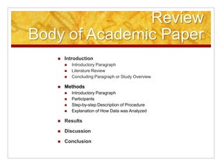 The document discusses the process of peer reviewing academic papers. It explains that peer review involves colleagues reviewing each other's papers to provide feedback on improvements before publication. The process described includes students sharing their papers in groups, reading each other's work, discussing comments and suggestions, and the author addressing areas reviewers did not understand. The goals of peer review are to help writers better organize and explain their ideas, and give them ways to strengthen their paper.