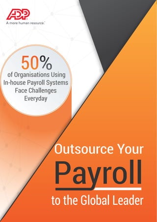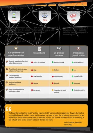 Outsourcing payroll to ADP can save companies money and reduce challenges. In-house payroll processing spends 235 more hours per year on tasks and 50% of SMBs lack confidence in keeping up with changing laws. Outsourcing to ADP provides highly flexible, automatic, and regularly updated payroll processing that ensures accuracy, compliance with regulations, and data security across borders in over 100 countries. ADP has over 60 years of experience and 630,000 global clients.
