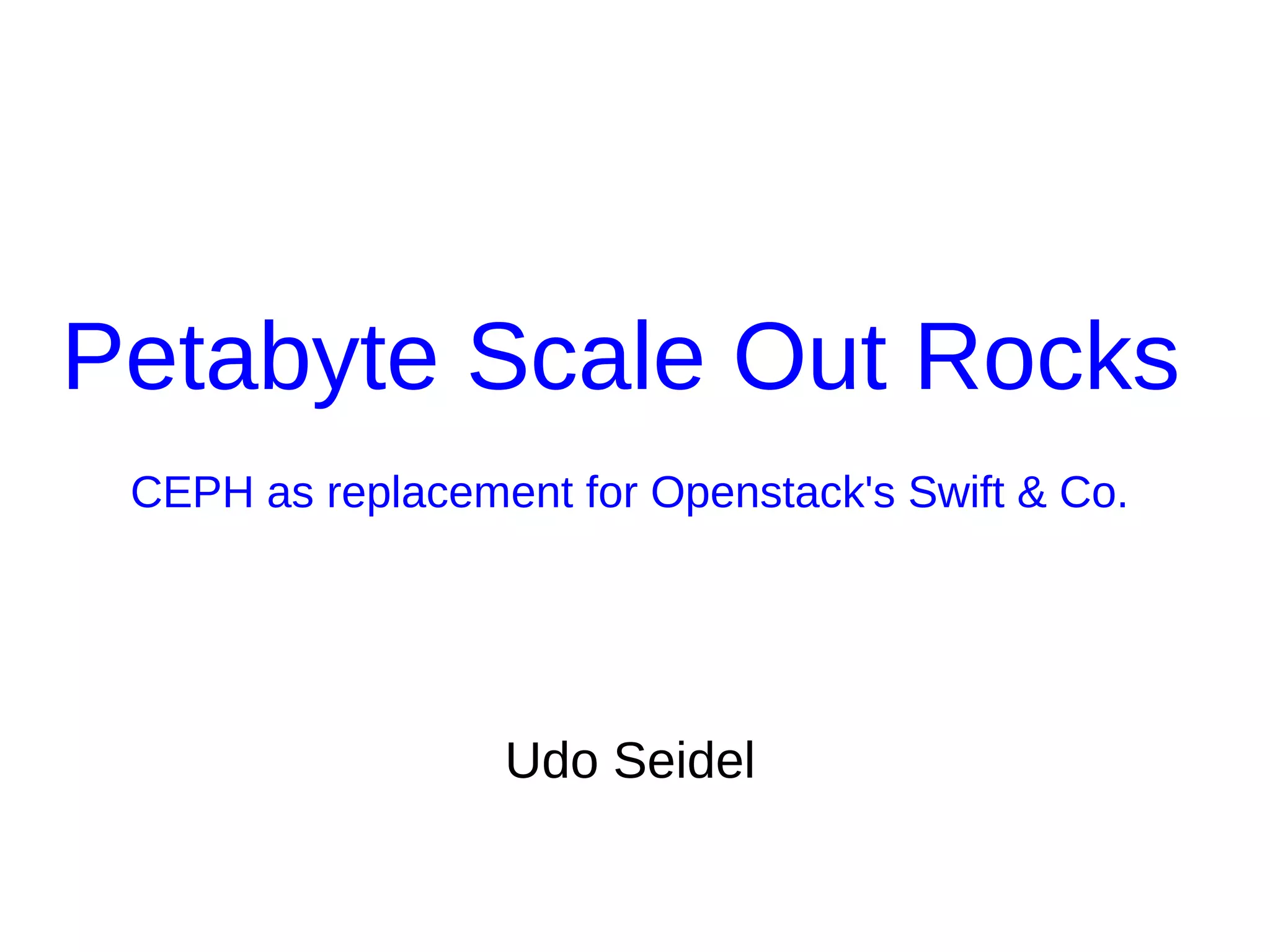 The document discusses Ceph, a distributed storage system, highlighting its architecture, the role of object-based storage devices, and integration with OpenStack. Ceph provides a scalable storage solution without single points of failure, utilizing a unique algorithm for data distribution and replication. The presentation emphasizes the benefits of using Ceph with OpenStack for various cloud storage needs.