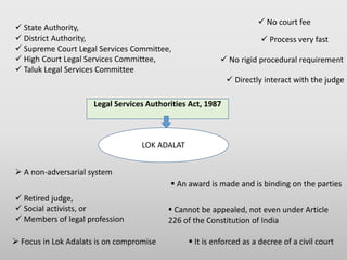 This document discusses Lok Adalats, which are alternative dispute resolution bodies in India established under the Legal Services Authorities Act of 1987. It provides that Lok Adalats aim to promote compromise between parties through non-adversarial proceedings before a presiding officer. Awards made by Lok Adalats are binding, enforceable as civil court decrees, and cannot be appealed. The document outlines the roles of various legal authorities in establishing and supporting Lok Adalats in India.