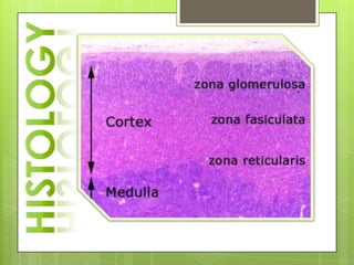 The adrenal glands are located above the kidneys and consist of an outer cortex and inner medulla. The cortex secretes mineralocorticoids like aldosterone and glucocorticoids like cortisol. The medulla secretes catecholamines such as norepinephrine and epinephrine. The pancreas contains clusters of cells called islets that secrete glucagon and insulin which regulate blood sugar levels. The ovaries and testes are reproductive endocrine glands. The ovaries secrete estrogens and progesterone while the testes secrete testosterone.