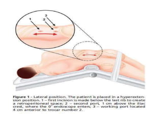 Laparoscopic and open adrenalectomy are surgical procedures to remove one or both adrenal glands. Laparoscopic adrenalectomy is preferred for benign tumors. Open adrenalectomy is used for large tumors or suspected cancer. The adrenal glands are located near the kidneys and removal involves carefully dissecting and ligating the adrenal vein. Potential complications include insufficient hormone production, bleeding, infections, and injury to nearby organs. Adrenalectomy is usually performed for conditions like Conn syndrome, Cushing syndrome, pheochromocytoma, adrenocortical carcinoma, or neuroblastoma.