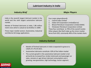 The document discusses marketing strategies for the lubricant brand Servo in India. It proposes several initiatives to associate the brand with speed, performance and modernity, including sponsoring a TV auto show, rally racing events, and displays at Indian Oil petrol pumps featuring Formula 1 branding. The strategies are intended to leverage the large distribution network of Indian Oil to reach customers and entrench brand associations with qualities like reliability and long-lasting engine life among youth audiences. A timeline lays out rolling out different initiatives over a two-year period to continuously promote the brand through high-visibility sponsorships and in-store displays.
