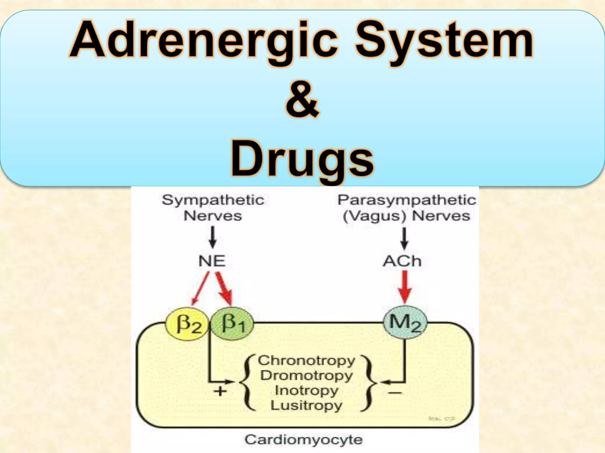 2) The different types of adrenergic receptors - alpha1, alpha2, beta1, beta2, and beta3 - and their locations and effects.