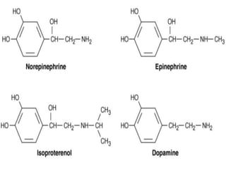 1) How catecholamines like norepinephrine and epinephrine are synthesized from phenylalanine and tyrosine and stored in vesicles for release.