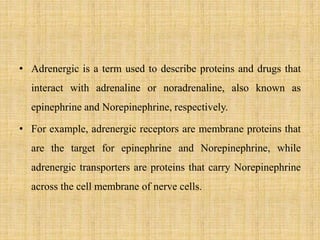 The adrenergic system involves proteins and drugs that interact with epinephrine and norepinephrine. Adrenergic receptors are membrane proteins targeted by these hormones, while transporters carry norepinephrine across cell membranes. Agonists produce similar effects and antagonists block effects.
