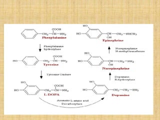 Epinephrine and norepinephrine act as hormones and neurotransmitters, regulating processes like smooth muscle contraction and increased blood pressure/glucose levels. Norepinephrine is synthesized in nerve cells and stored in vesicles for release. It initiates the fight-or-flight response through alpha and beta receptors in various tissues.
