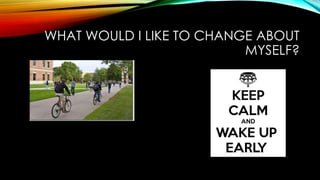 This document discusses behavior change techniques such as goal setting and tracking cues to action. It provides an example of tracking bike rides to campus, with goals of keeping gas in the tank and bike maintenance. Despite strategies to use a bike for transportation, the author had issues with theft and flats. To wake up earlier, the author set alarms and read motivational quotes, but found the key was changing bedtime to support the wake up goal.