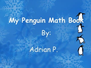 The document is a math book about penguins that prompts the reader to count penguins, write number sentences by grouping penguins, and order and color penguins by number. The reader is asked to count 20 penguins, write the number sentences 7+3=10 and 3+4+3=10 by grouping penguins, order 10 penguins from largest to smallest number, and color items by number using different colors.