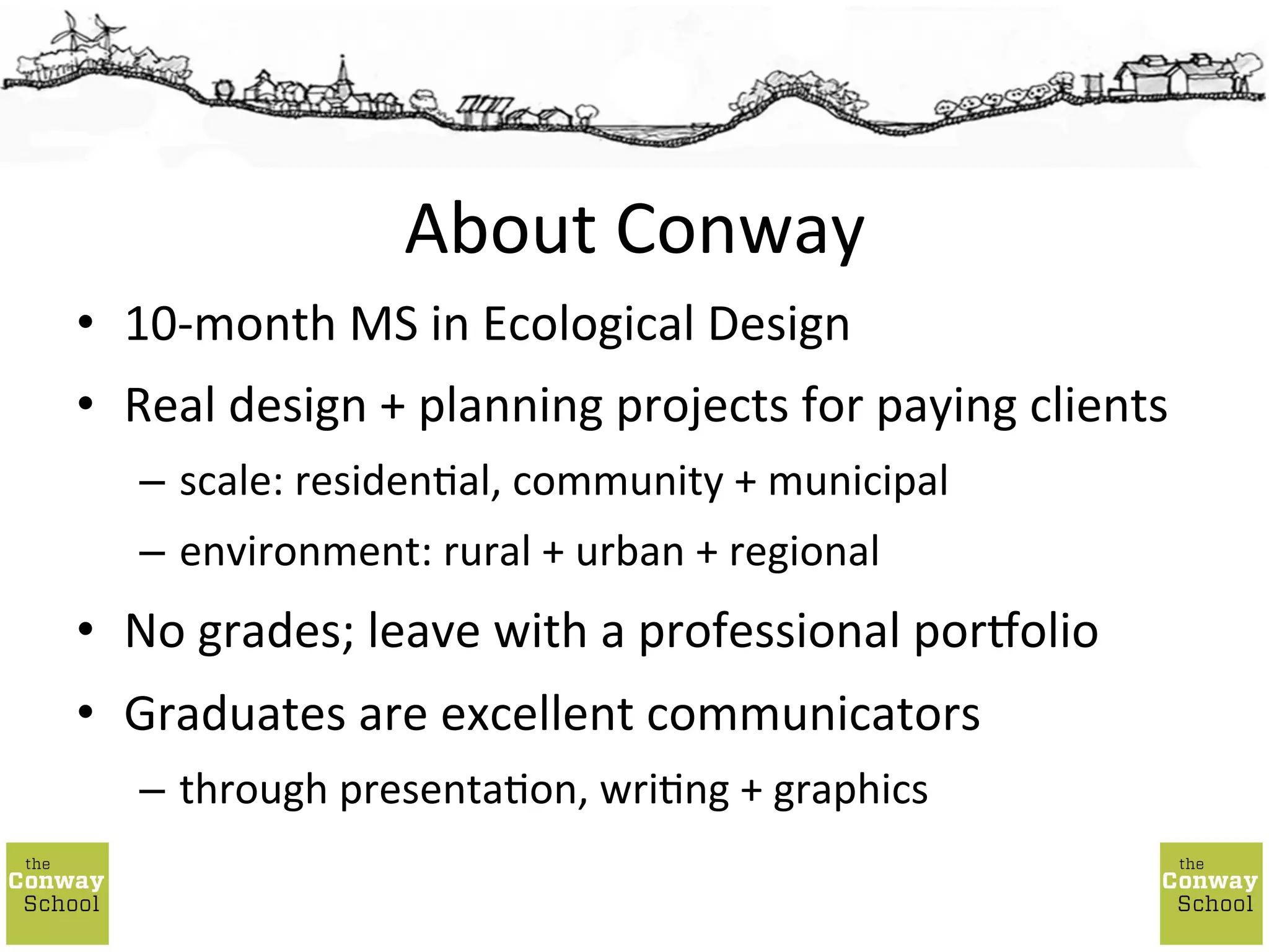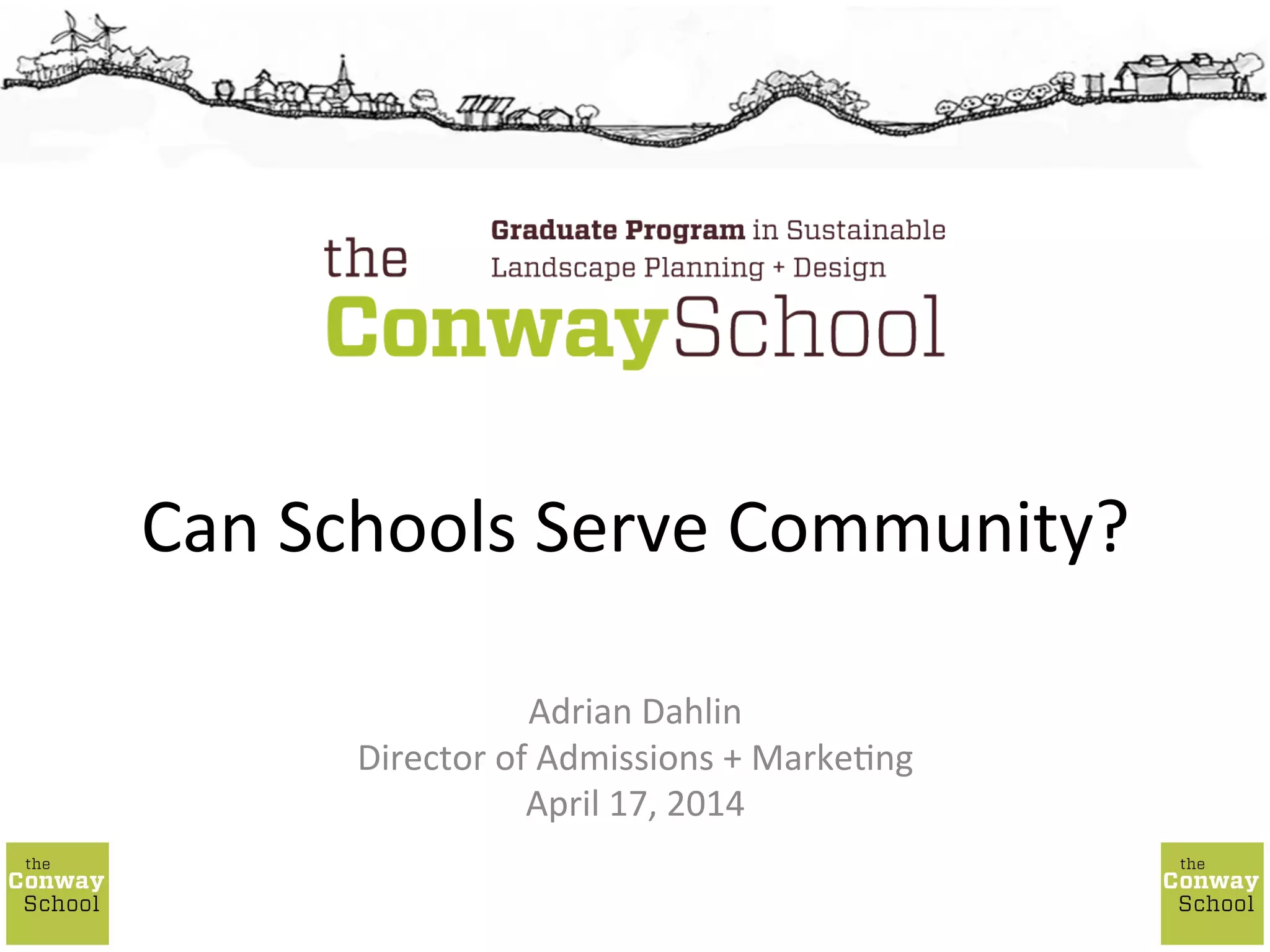 The document discusses how schools can serve their local communities through design projects. The Conway School of Landscape Design partners with various communities to complete real design projects for paying clients at both small and large scales. Some examples of projects include food security plans for different cities, green infrastructure plans, and public park designs. The school's methodology involves extensive client and community input, data analysis before designing solutions, and public presentations of alternatives. Their approach aims to educate without preaching and listen to the community perspective.