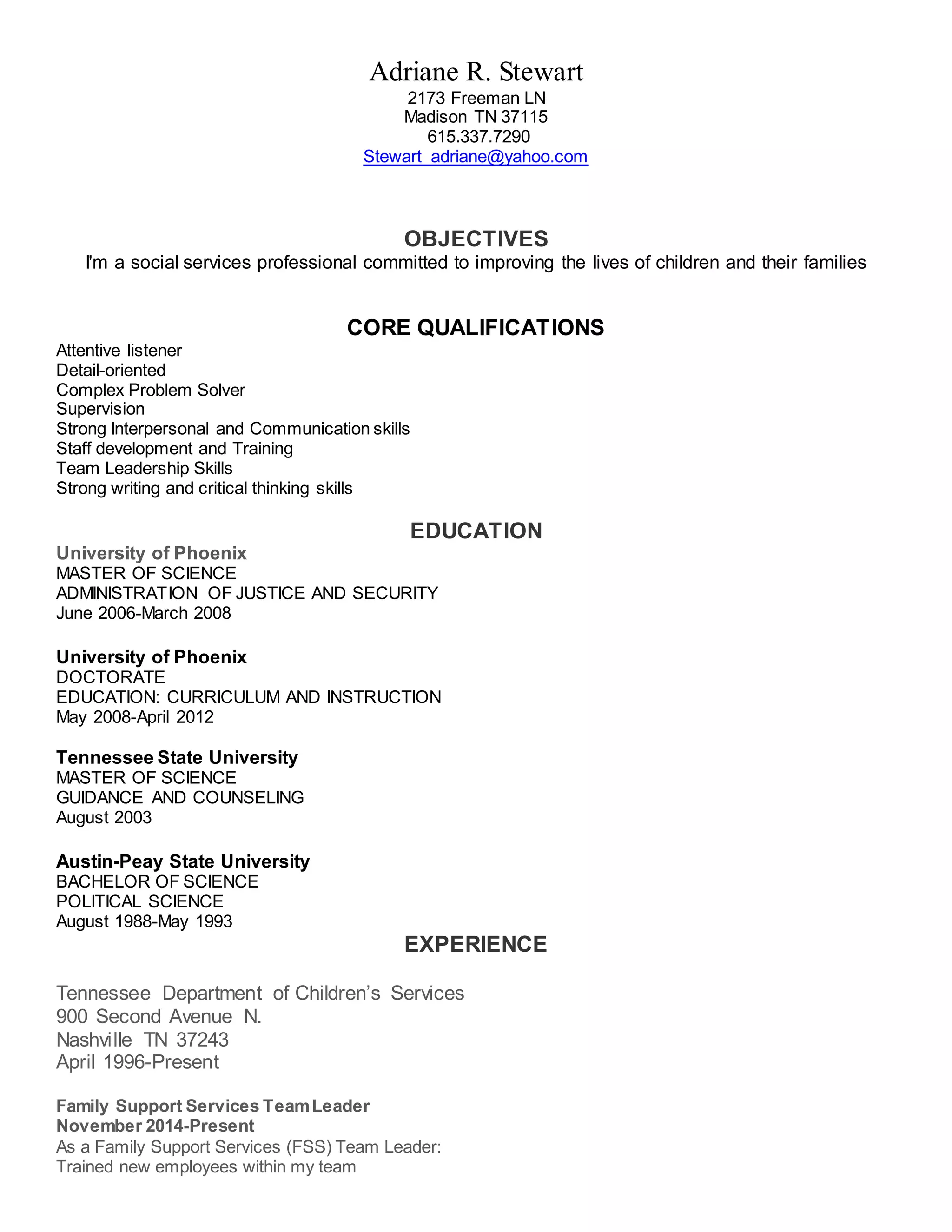 This document is a resume for Adriane R. Stewart, who has over 20 years of experience in social services and child welfare. She currently works as a Family Support Services Team Leader for the Tennessee Department of Children's Services, where she supervises a team of 7 employees and oversees 90 cases. Previously she held positions as a Child Protective Services Assessment Team Leader and Investigation Team Leader, supervising teams and monitoring over 100 cases in each role. She has a Doctorate in Education from the University of Phoenix and Master's degrees in Administration of Justice/Security and Guidance and Counseling.