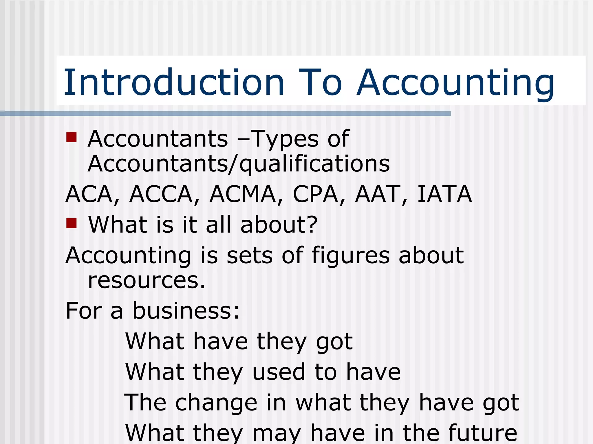 1. It defines accounting as recording financial information about resources owned (assets), owed (liabilities), and equity. It outlines the different types of accountants and their qualifications.