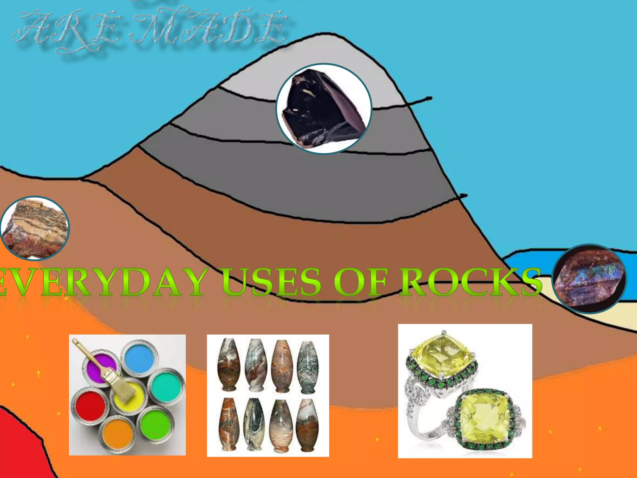 Sedimentary rocks are formed by sediment deposited in layers over time in bodies of water. Metamorphic rocks have been changed by extreme heat and pressure over time. Igneous rock forms when magma cools and solidifies above or below the Earth's surface. All three rock types have everyday uses.