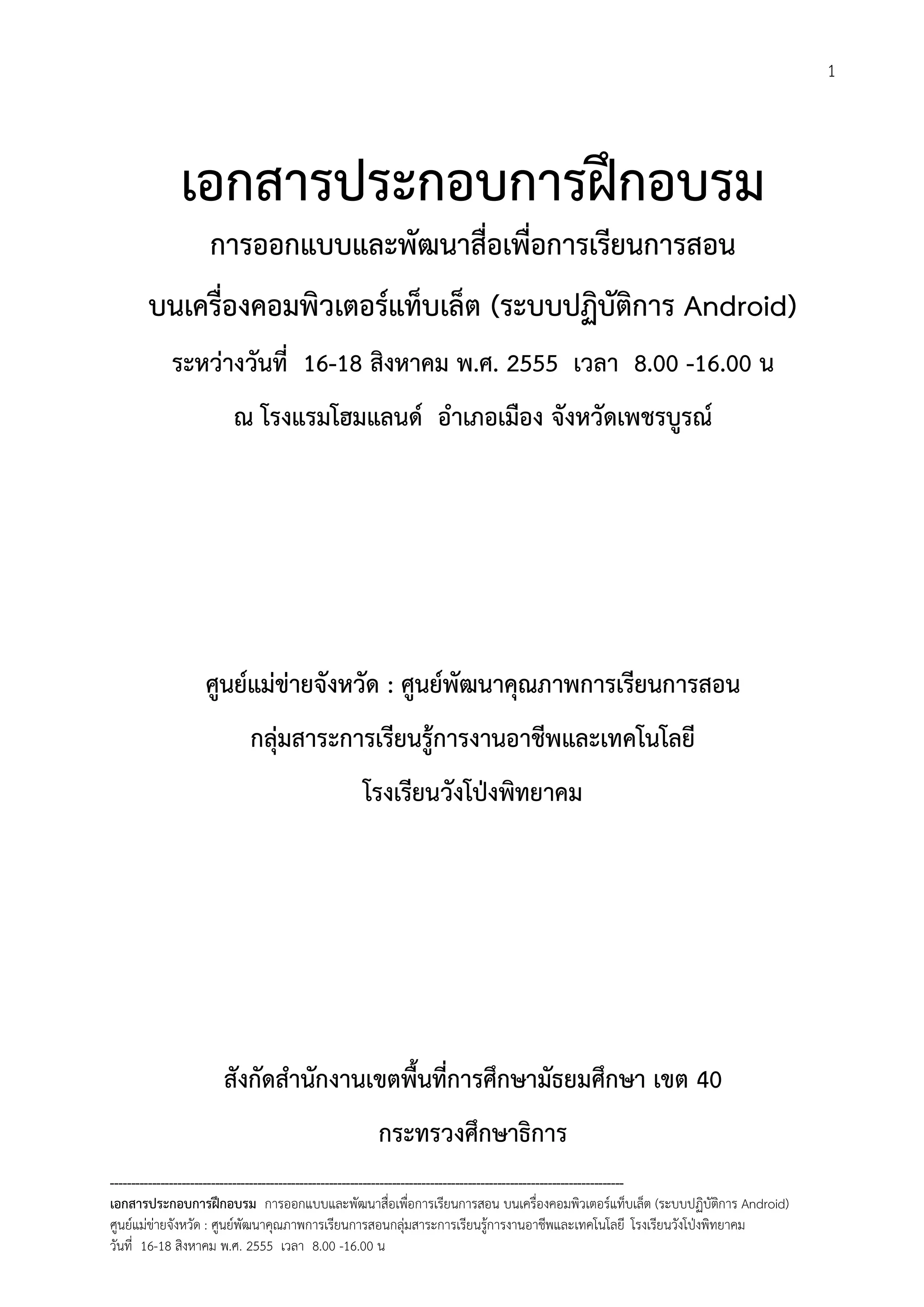 (ระบบปฏิบัตการ Android) ่ ิ ศูนยแมขายจังหวัด : ศูนยพัฒนาคุณภาพการเรียนการสอนกลุมสาระการเรียนรูการงานอาชีพและเทคโนโลยี โรงเรียนวังโปงพิทยาคม วันที่ 16-18 สิงหาคม พ.ศ. 2555 เวลา 8.00 -16.00 น