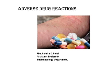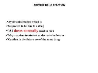 This document discusses adverse drug reactions and pharmacovigilance. It defines an adverse drug reaction as an unwanted change caused by a drug at normal doses that requires treatment or a dose decrease. Adverse drug events are untoward occurrences during treatment that are not necessarily caused by the treatment. The document classifies adverse drug reactions into types A, B, C, D and E based on factors like dose, time of onset, and mechanism. It also discusses preventing adverse drug effects through appropriate use and monitoring for new symptoms after starting treatment. Pharmacovigilance aims to detect, understand and prevent adverse drug reactions through postmarketing surveillance.