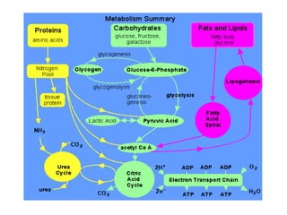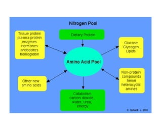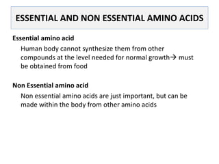 This document discusses protein metabolism, including essential and non-essential amino acids. Essential amino acids cannot be synthesized by the human body and must be obtained through diet. Non-essential amino acids can be synthesized from other amino acids or compounds. The document also outlines the processes of protein digestion, amino acid catabolism through transamination and the urea cycle, and analytical techniques for purifying and characterizing proteins like polyacrylamide gel electrophoresis and Edman degradation.