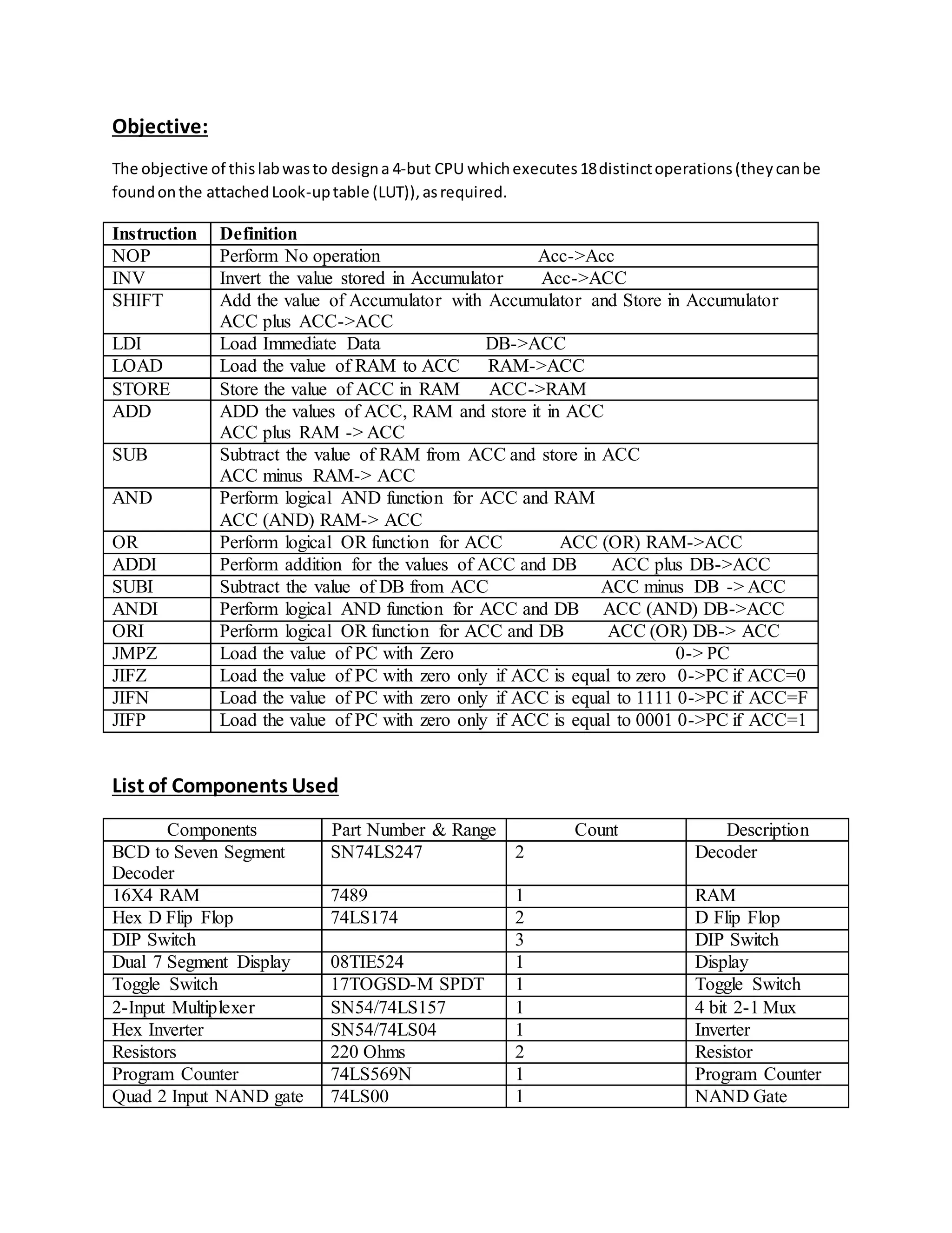 The 4-bit CPU was designed to execute 18 distinct operations from a lookup table. It was tested by executing an instruction set that performed operations like load, store, add, and jump instructions. The accumulator and program counter displays were observed after each instruction to verify the correct operations. Various components like a RAM, ALU, program counter, and decoders were used in the design. The group members demonstrated different parts of the instruction set to verify the CPU was functioning properly.