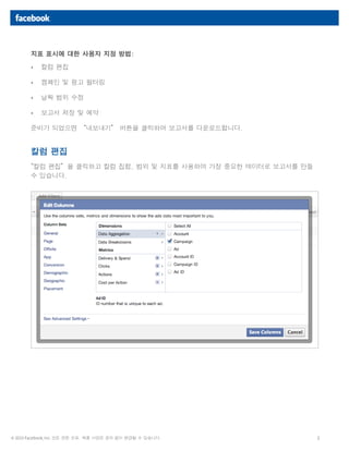 Inc. 모든 권한 보유. 제품 사양은 공지 없이 변경될 수 있습니다. 미리 정의된 칼럼 집합: • 일반: 캠페인, 도달, 빈도, 노출, 지출한 금액, 1000회 노출당 비용(CPM), 클릭당 비용(CPC), 클릭수, 클릭률(CTR), 행동 등을 포함합니다. • 페이지: 캠페인, 페이지 좋아요, 페이지 참여, 페이지 좋아요당 비용 등을 포함합니다. • 오프사이트: 캠페인, 클릭수, 중복된 숫자를 거른 클릭률, 클릭률(CTR), 도달, 빈도, 노출, 지출한 금액, 클릭당 비용(CPC), 1000회 노출당 비용(CPM) 등을 포함합니다. • 앱: 캠페인, 앱 설치, 앱 참여, 모바일 앱 설치, 모바일 앱 설치당 비용 등을 포함합니다. • 전환: 캠페인, 전환, 체크아웃, 가입, 웹사이트 전환당 비용, 체크아웃당 비용 및 가입당 비용 등을 포함합니다. • 인구 통계: 계정, 연령, 성별, 도달, 빈도 등을 포함합니다. • 지역: 계정, 국가, 도달, 빈도 등을 포함합니다. • 배치: 계정, 배치, 도달, 빈도 등을 포함합니다. 특정 칼럼을 추가하거나 삭제할 수도 있습니다. 모든 행동 지표, 행동당 비용 지표 및 배치를 포함한 전체 범위 및 지표 목록에서 선택할 수 있습니다. “칼럼 저장”을 클릭하면 선택한 내용이 자동으로 보고서에 반영됩니다. 보고서에 포함할 수 있는 칼럼 수에는 제한이 없으나, 지정한 날짜 범위와 필터에 맞는 데이터만 보고서에 표시됩니다.