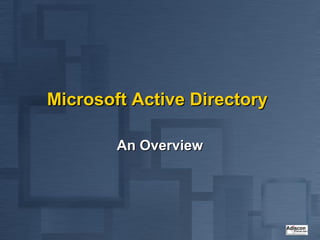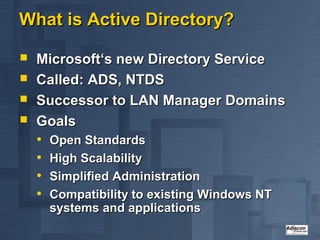 Active Directory is Microsoft's directory service that is the successor to LAN Manager domains. It aims to provide open standards, high scalability, simplified administration and compatibility with existing Windows NT systems and applications. Active Directory uses a hierarchical structure with domains, trees and forests. It contains objects like users, groups, computers and distribution lists. Changes are replicated between domain controllers to provide multi-master replication. Active Directory relies on DNS and requires at least two domain controllers. It is an important part of Microsoft's strategy with many applications now integrating with it.