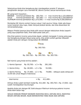 Dokumen tersebut mempromosikan sebuah bisnis multi level marketing (MLM) bernama ads4bucks.com yang menawarkan berbagai produk teknologi informasi seperti virtual office, sms blaster, blog, e-mall, dan e-library. Bisnis ini menjanjikan penghasilan hingga Rp33,7 juta per bulan bagi anggota yang berhasil merekrut tiga orang dan membantu mereka merekrut tiga orang lainnya. Untuk bergabung, calon anggota diharuskan membeli bisnis