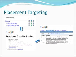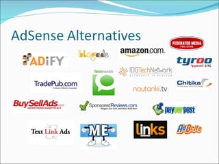 The document provides tips and best practices for blog monetization through Google AdSense including placement of ads, improving ad relevance through site search, understanding metrics like click-through rate and bounce rate, common mistakes to avoid, keeping content fresh, ideas for direct ad sales, and resources for further information. It recommends testing different ad formats and backgrounds, focusing on authority and relevant anchor text for links, and not getting complacent if monetization efforts are already successful.